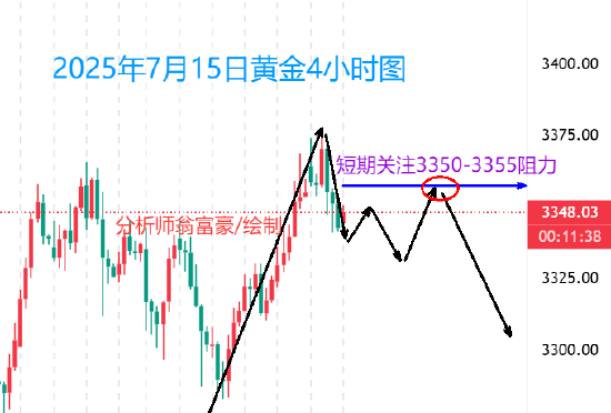 7月15日,黄金昨日冲高后持续回落,美盘时段反弹动能明显不足,最终未能收复失地延续跌势,短线多头力量衰竭已转向弱势,后市可能进一步下探,翁富豪建议早盘现在3350-3355布局空单。从技术面看,黄金30分钟图已形成双重顶形态,昨日白盘虽两次在3353获得支撑,但晚间却放量跌破该关键位且未能收复失地,表明多头力量已显著转弱;当前30分钟均线系统已开始向下拐头,若后续形成死叉结构,空头力量或将加速释放。
